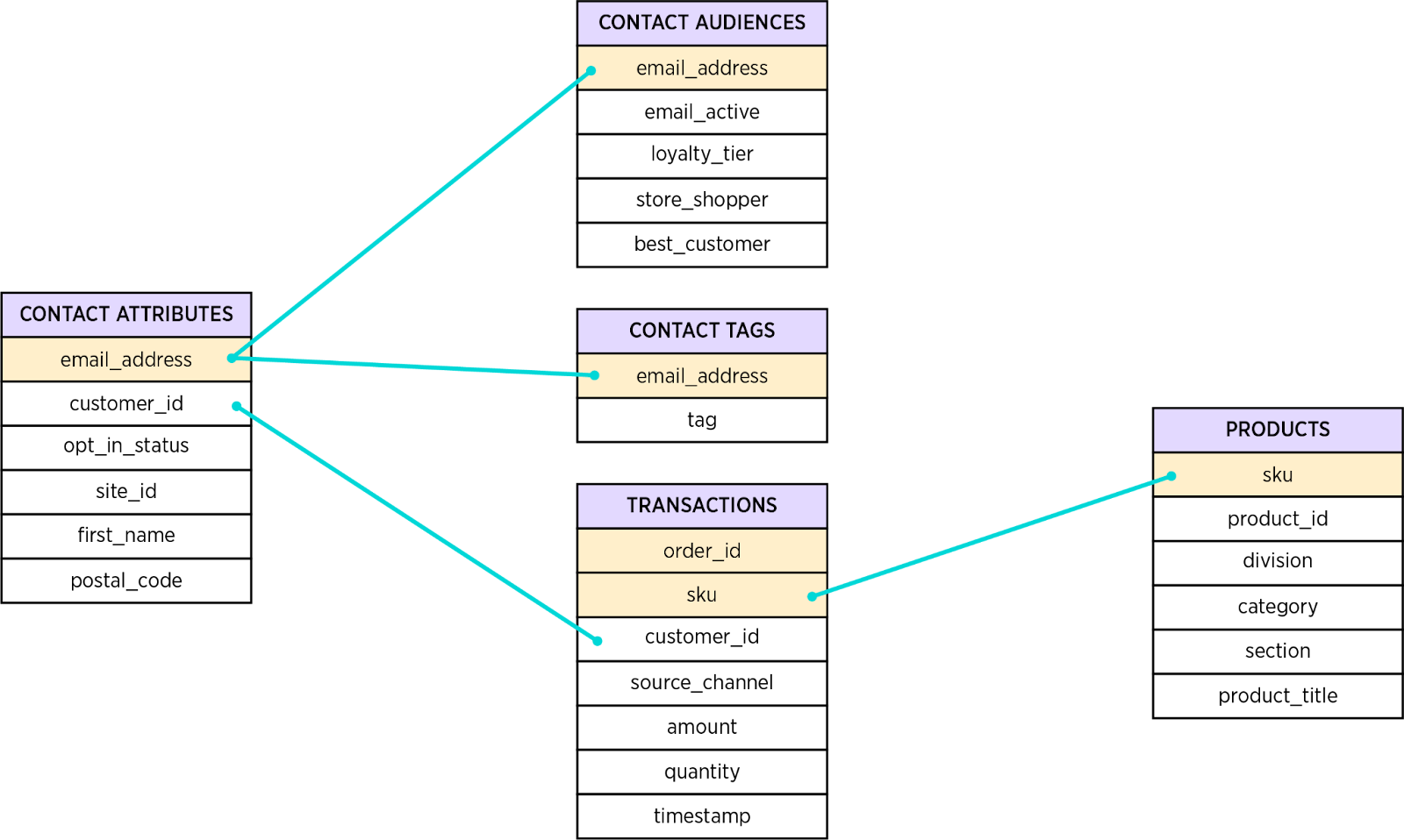 🎯 Ready to share Transactions Data with Movable Ink? Click here, then follow the instructions to share sample data with your account team. In this schema document, only provide sample contact list/profile attribute datapoints - not real customer data. |